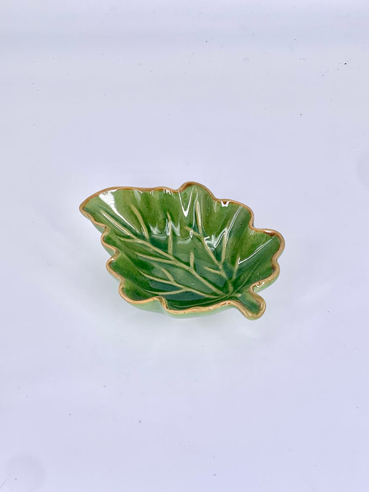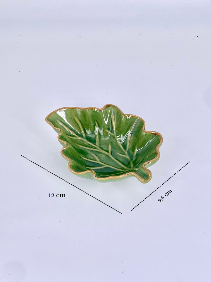 Folha louça verde pequena. Serve como peça decorativa e também para colocar pequenas entradas como patê e azeitonas.