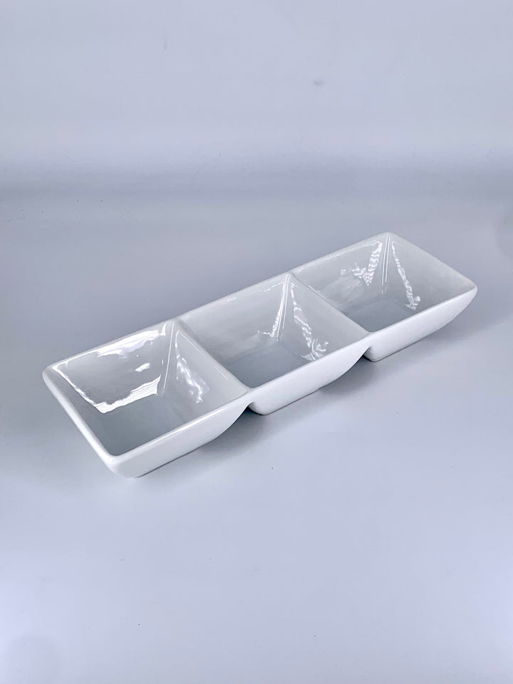 Funcional e elegante, o prato branco retangular com 3 divisórias é ideal para servir aperitivos e molhos de forma organizada.